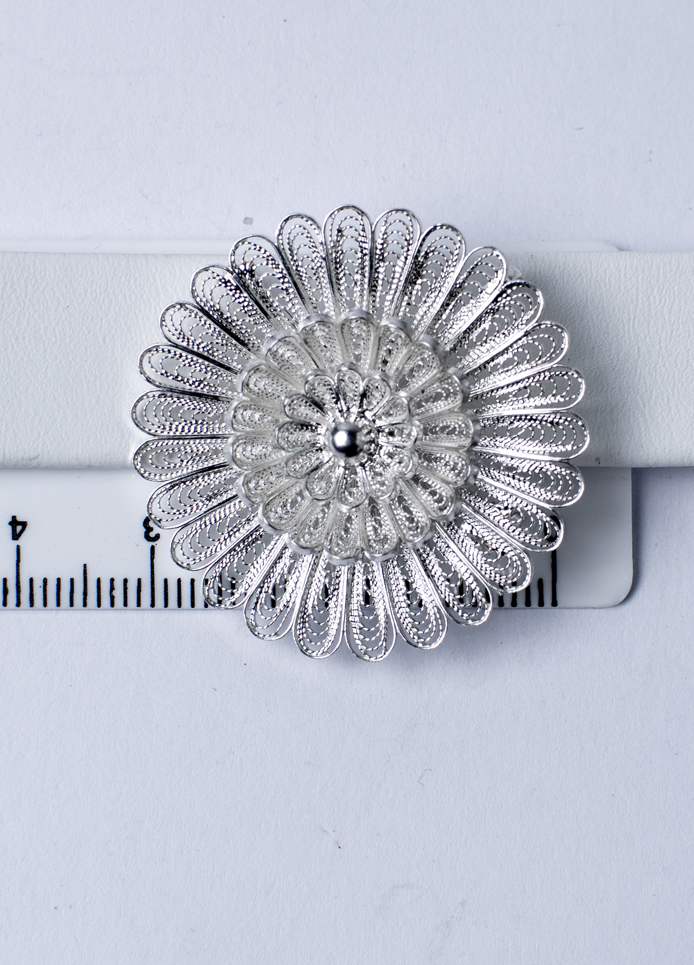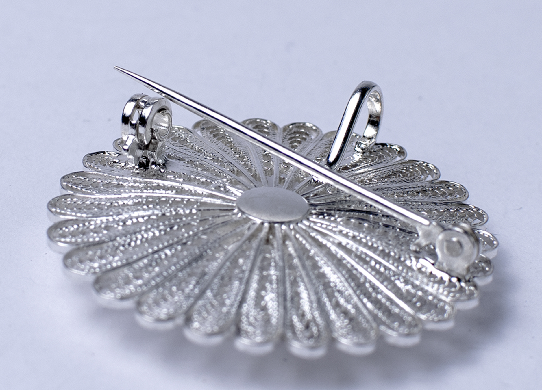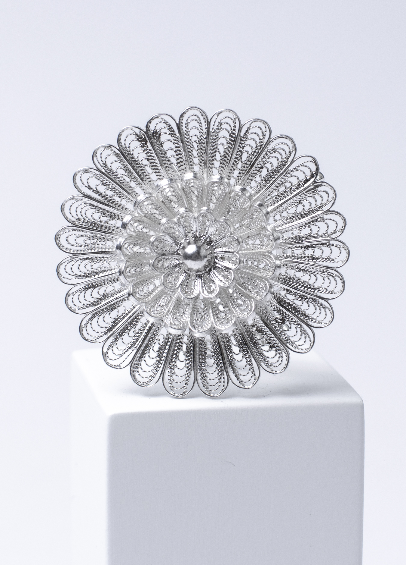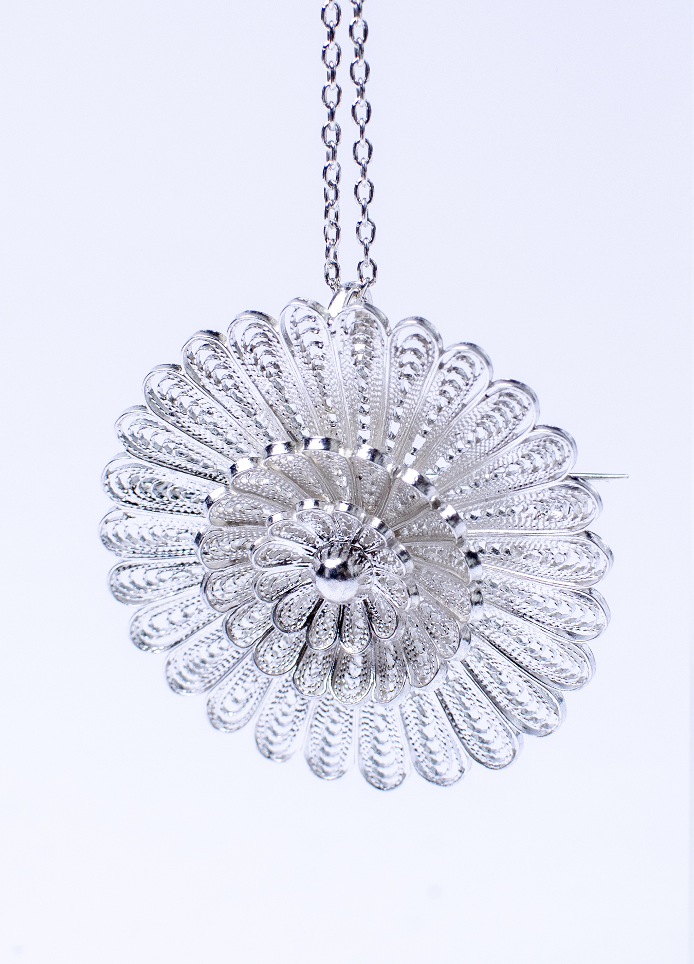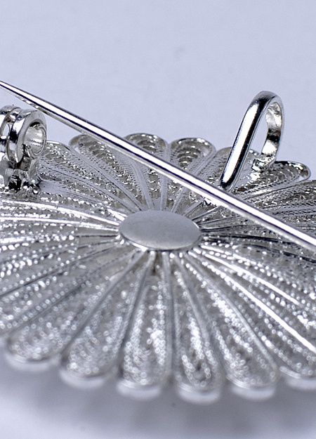 Portuguese decoration in the shape of a flower. The almost transparent weave of thin silver threads allows light to pass through this jewelry, creating a whimsical play of shadows.