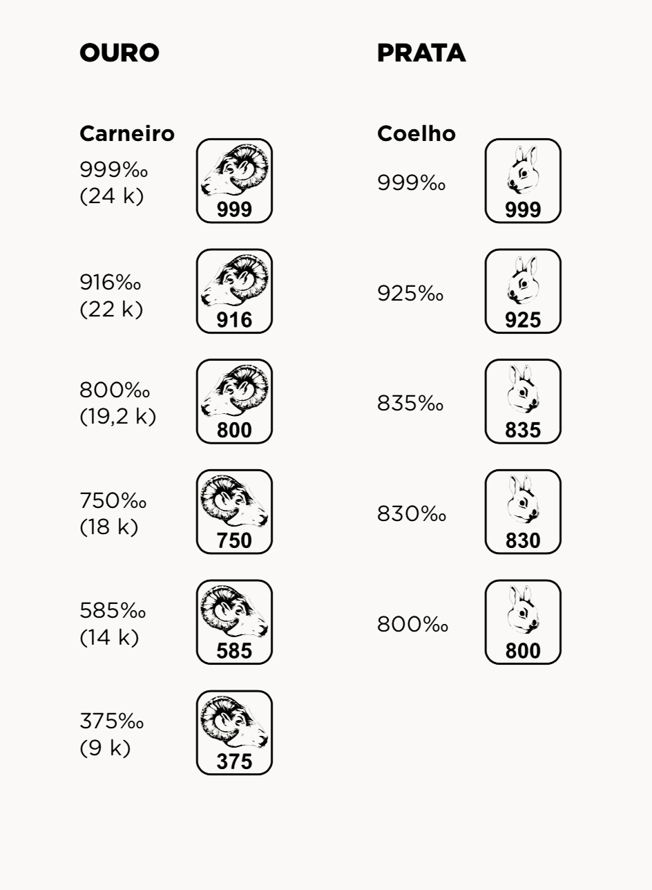 To confirm the quality of the alloys used, there is a control system, which consists of applying a stamp (punch) to the products by the Portuguese Assay Office Contrastaria (an organization authorized at the national level to check and guarantee the metal content of alloys).